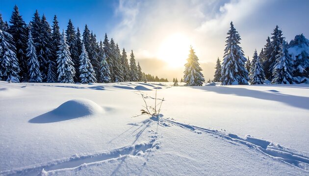 A sunlit winter scene displays fresh snow, a bright sky, and snow-covered pine trees, with visible tracks on the snow