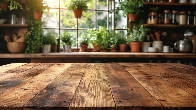 Rustic kitchen setting with a wooden table foreground and a cozy backdrop filled with plants and sunlit kitchenware.