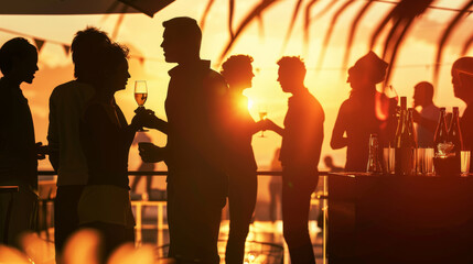 An outdoor sunset cocktail party with silhouetted guests, glowing in the warm evening light and enjoying the festive atmosphere.