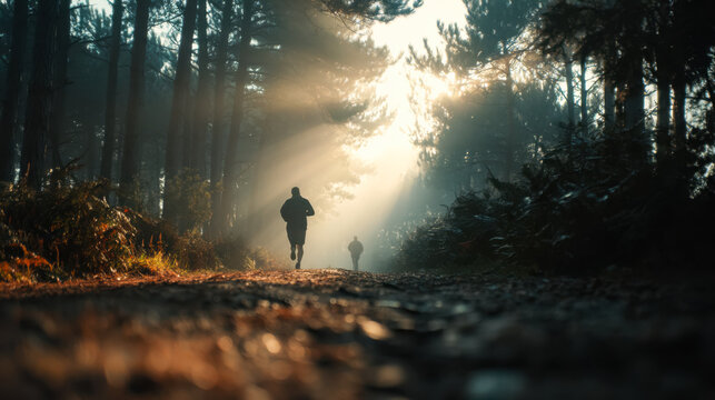 Couple walking hand in hand through sunlit forest trail during golden hour, romantic stroll