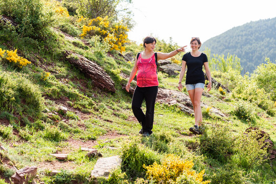 Pregnant woman and female friend walking along trail in mountainous terrain while talking and pointing away during trekking in summer