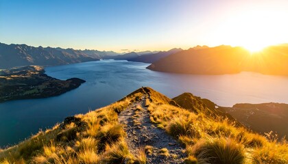 red hoodoo canyon trail winding through sunlit sandstone amphitheater under vivid blue sky, sparse juniper and pine dot orange slopes, pristine hiking