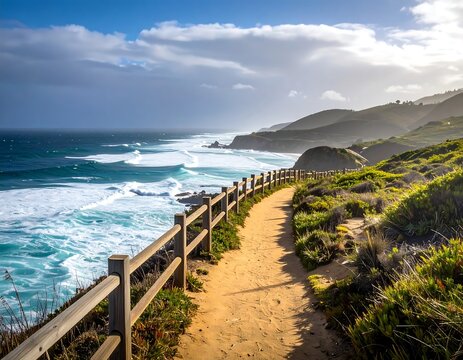 Coastal path, sunlit waves