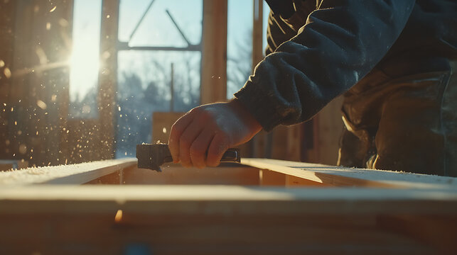 Carpenter sanding wood plank with power sander in sunlit workshop