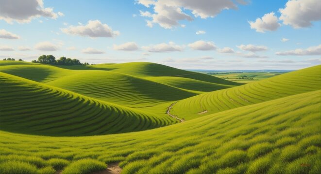 Rolling green hills under a bright, partly cloudy sky, creating a serene landscape.