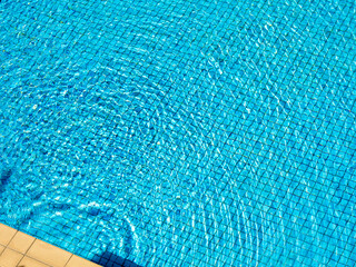 Top view of blurred round rippled on clear water on blue mosaic tiles in swimming pool background. Empty space on poolside near pool edge on sunny day, holiday summertime.