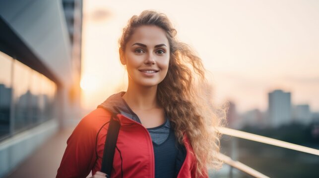 A beautiful young woman with a radiant smile, wearing a red athletic jacket, stands outdoors in the morning light, ready for an invigorating run.