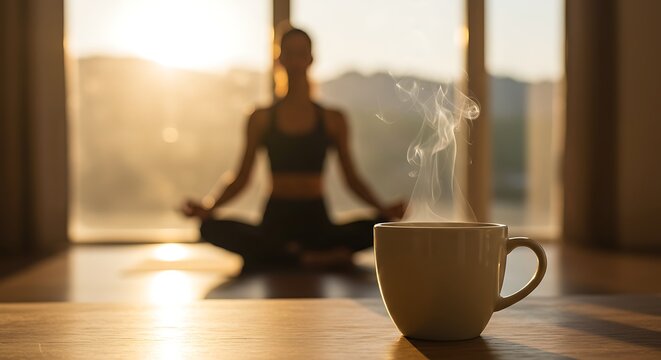 Woman meditating in lotus position with mug of hot drink steaming in the foreground indoors at sunrise