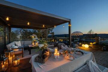 Cozy rooftop terrace with comfortable seating, warm string lights and candles glowing at sunset with cityscape in the background