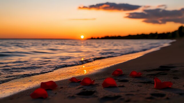 Red rose petals scattered along sandy beach at sunset with gentle waves and golden sun reflecting on ocean surface creating romantic atmosphere.