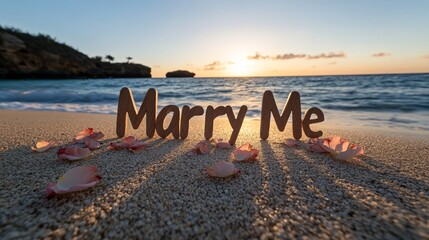 Magical Beach Proposal Scene at Sunset with Glowing "MARRY ME" Letters, Heart-Shaped Arrangement of White Roses and Candles, Set Against a Backdrop of Ocean Waves and Dramatic Clouds