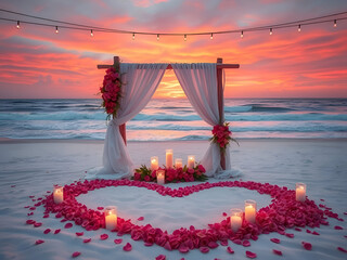 Marriage proposal setup on beach sunset with red roses, flowers and candle lights and decoration.