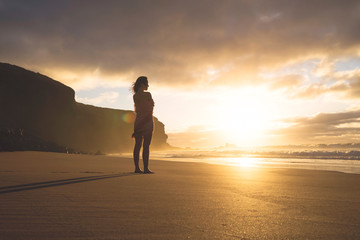 Woman standing on the beach at sunset