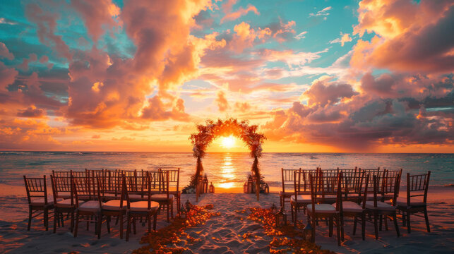 beautiful sunset beach wedding ceremony with an arch and floral decorations, surrounded by wooden chairs facing the ocean at golden hour. wedding setup on beach. creating a romantic atmosphere