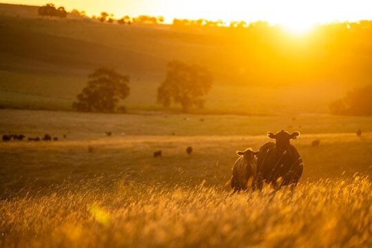 Fat Beef cows grazing on native grasses in a field on a farm practicing regenerative agriculture in Australia. Hereford cattle on pasture. livestock Cows in a field at sunset with golden light.