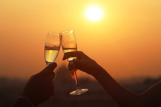 Two glasses of champagne or wine, couple dating concept, romantic celebration of engagement or anniversary on the sundown lights.