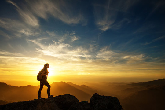 Success woman hiker hiking on sunrise mountain peak - Young woman with backpack rise to the mountain top. Discovery Travel Destination Concept