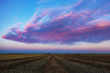 Swathed canola field at sunset with glowing pink clouds; Legal, Alberta, Canada