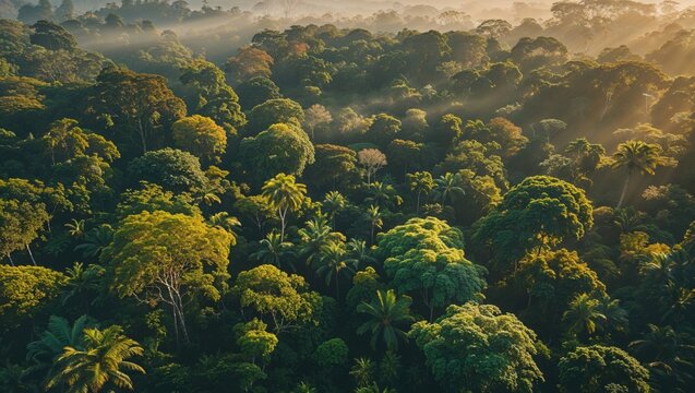 Sunlight beams filtering through dense green forest canopy creating dramatic rays. Golden light streaming between tree branches with atmospheric fog and mist