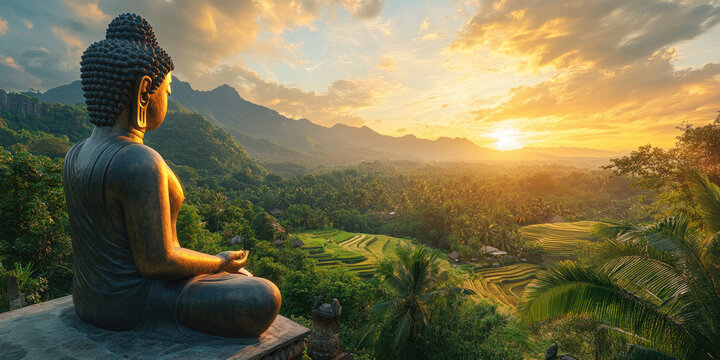 Buddha statue meditating over an expansive landscape, golden sunset illuminating terraced rice fields and lush green mountains in a peaceful Asian vista