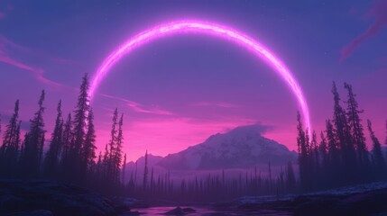 Pink ethereal arch over snowy mountain range in a mystical forest landscape.