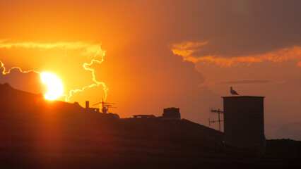 Stunning fiery sunset with dramatic clouds over rooftops and distant mountains view