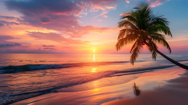 Serene sunset beach with palm trees and gentle waves