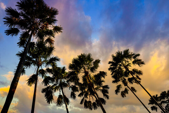 Tropical sunset with dramatic clouds and palm trees