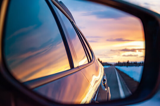 Sunset Reflection In Car Side Mirror On Highway Images