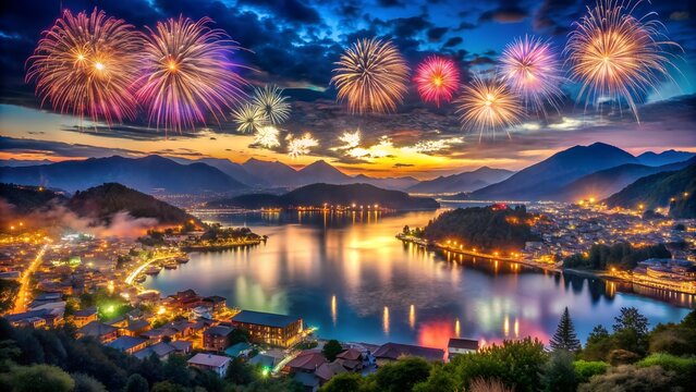 Colorful fireworks over a tranquil lake and town at sunset with mountains
