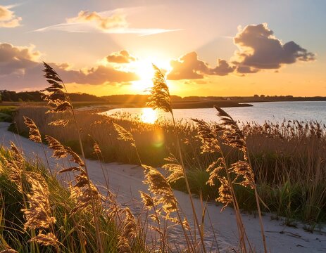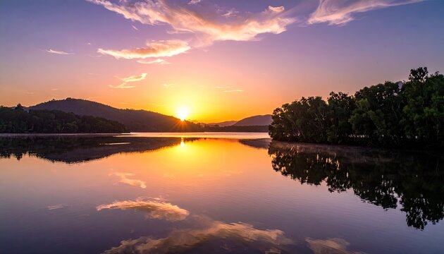 A mesmerizing sunset over a tranquil lake, casting a golden glow on the surrounding landscape. Concept of serenity and natural beauty. Generative Ai.