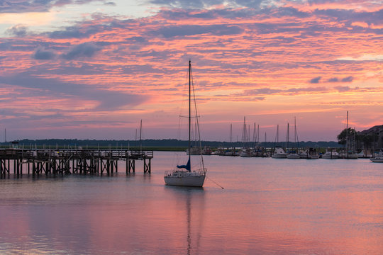Spectacular sunset over the inter coastal waterway.  Sailboats.  Beautiful skies.