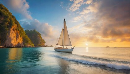 Serene sunset sail: solitary sailboat reflecting on calm waters