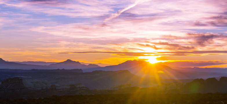 Serene sunset over mountain valley with golden light