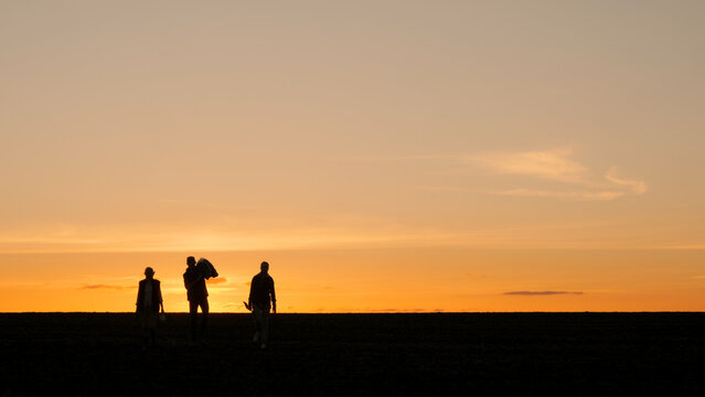 Silhouettes of three farmers in a field. Walking with equipment against the backdrop of a picturesque sunset