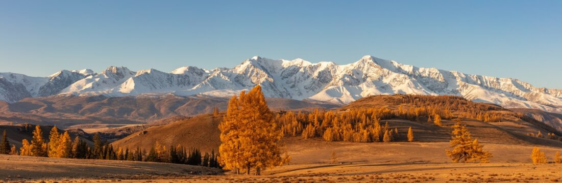 Beautiful panorama with a valley full of golden trees in the foreground and white snowy mountains  in the background. Sunrise. Altai mountains. Golden hour
