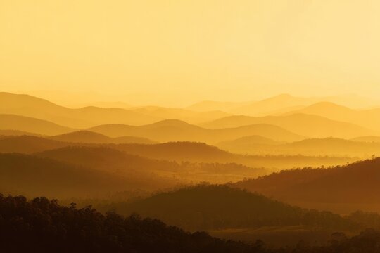 Golden sunset over layered rolling hills and valleys, silhouettes of trees in the foreground. Concept Golden Hour Landscape, Layered Hills at Sunset, Tree Silhouettes in Foreground