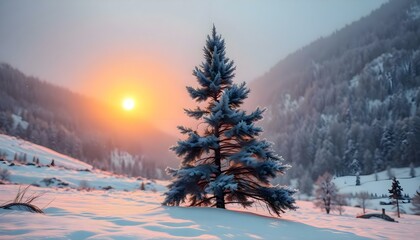 Serene winter landscape at sunset with snow-covered trees