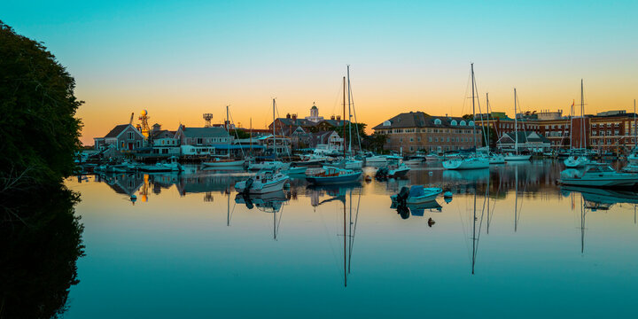 Tranquil sunrise seascape with moored boats and yachts at the marina in Woods Hole, Massachusetts. Blue ocean and sky with orange reflections of the daybreak.