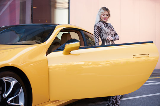 Young woman with shopping bag near the yellow super car, outdoors