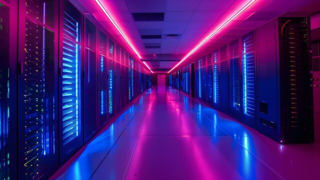 AI Training Environment A captivating interior shot of a data center filled with powerful supercomputers radiating bright lights. This visual highlights the intricate connection between