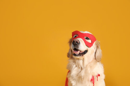 Adorable dog in red superhero cape and mask on yellow background, space for text