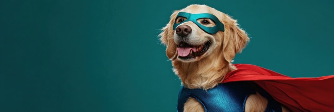 A heroic dog dressed as a superhero stands proudly with a cape, ready to save the day in a colorful studio setting