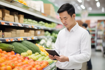 Asian grocery store manager salesman in apron using digital tablet counting goods in supermarket. Male worker employee doing inspection of products regular inventory to control goods online order