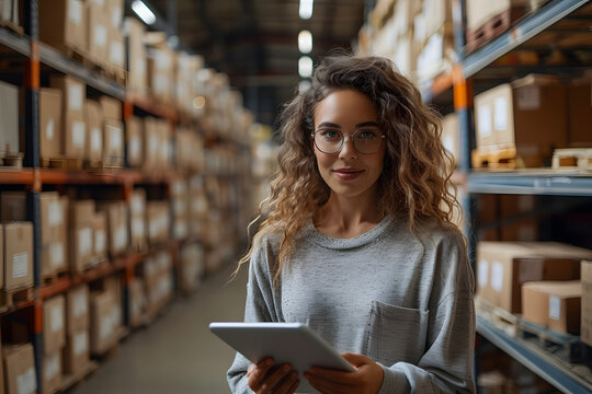 Using a digital tablet as part of an intelligent warehouse management system, a supervisor or female employee checks the stock inventory.