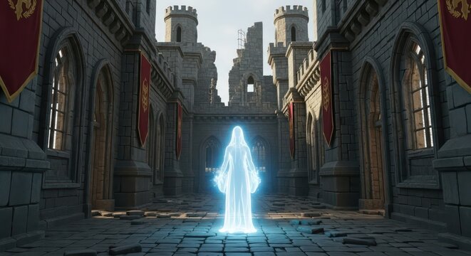Ethereal Figure in a Medieval Castle Courtyard with Ruined Architecture