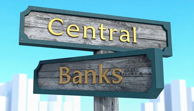 Wooden signpost with "Central Banks" against a blue sky and blurred buildings in the background.