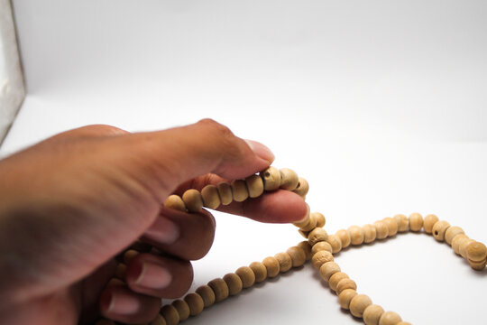 Male hand asian holding muslim beads rosery or tasbih for pray with isolated background.
