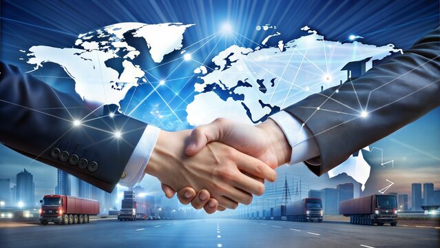 dynamic transportation and logistics concept, showcasing various modes of freight transport such as trucking and aviation, integrated with digital connectivity and global networking.