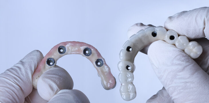 Dental implant supported full arch porcelain dental prosthesis for edentulous jaws in dentistry. Intraosseous dental implant and full arch dental prosthesis treatment. smile makeover.